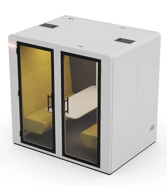 A cabine Sixo – New Khara permite a utilização por 6 pessoas, onde é possível usufruir de um ambiente silencioso e agradável para discutir ideias, alinhar estratégias ou realizar trabalhos colaborativos.